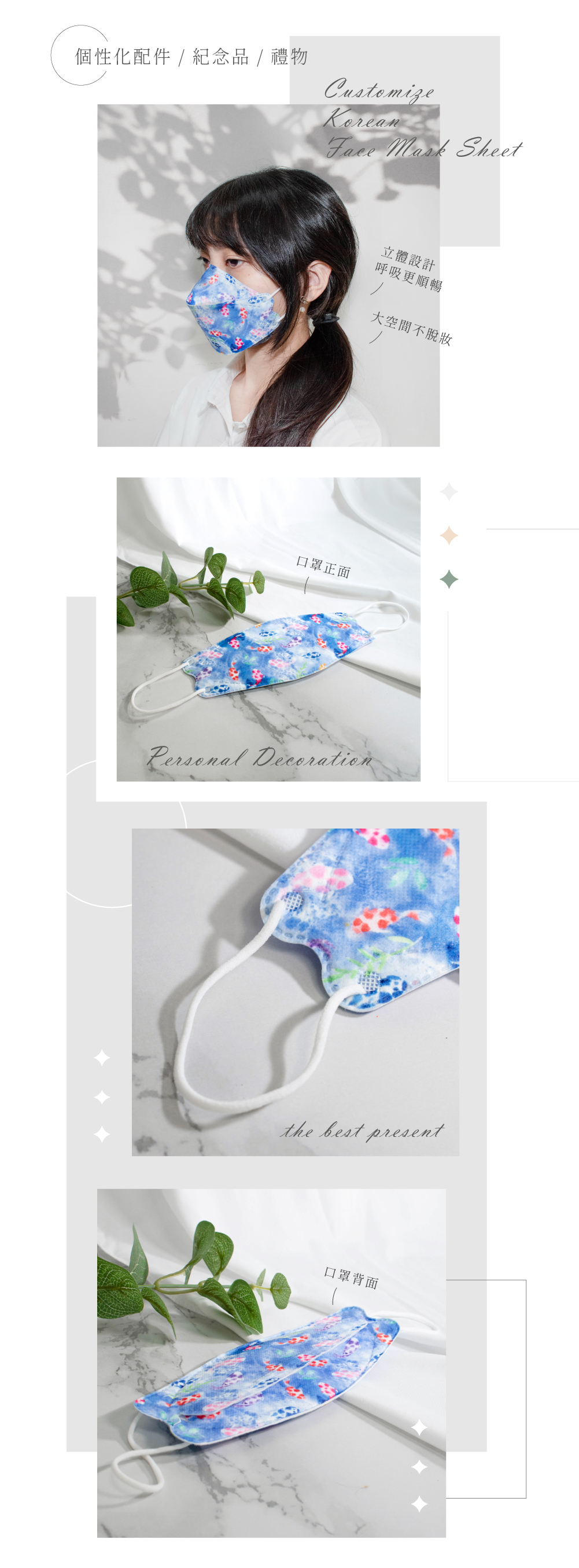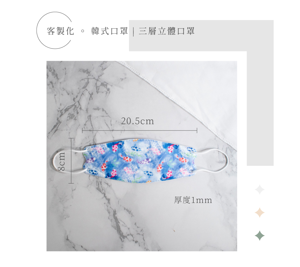 ※ 經由您確認後的客製圖案,將經由美編複製並排列成「製作口罩的布料花紋」;因此每一片口罩的花紋位置也會有些微不同哦 !