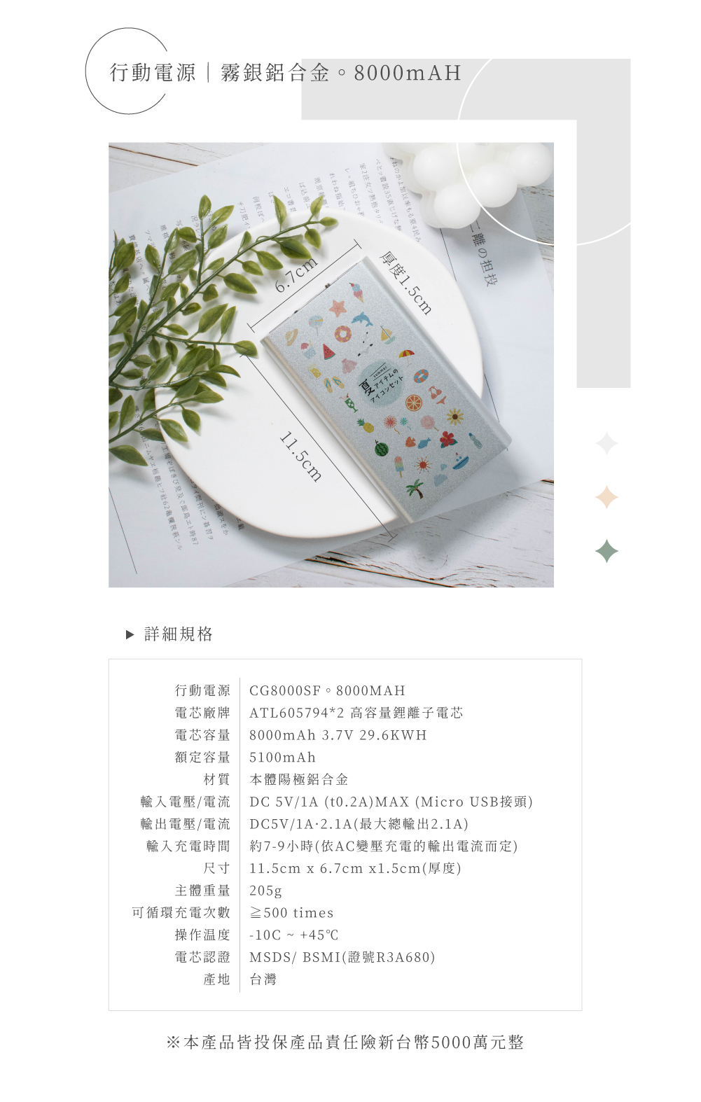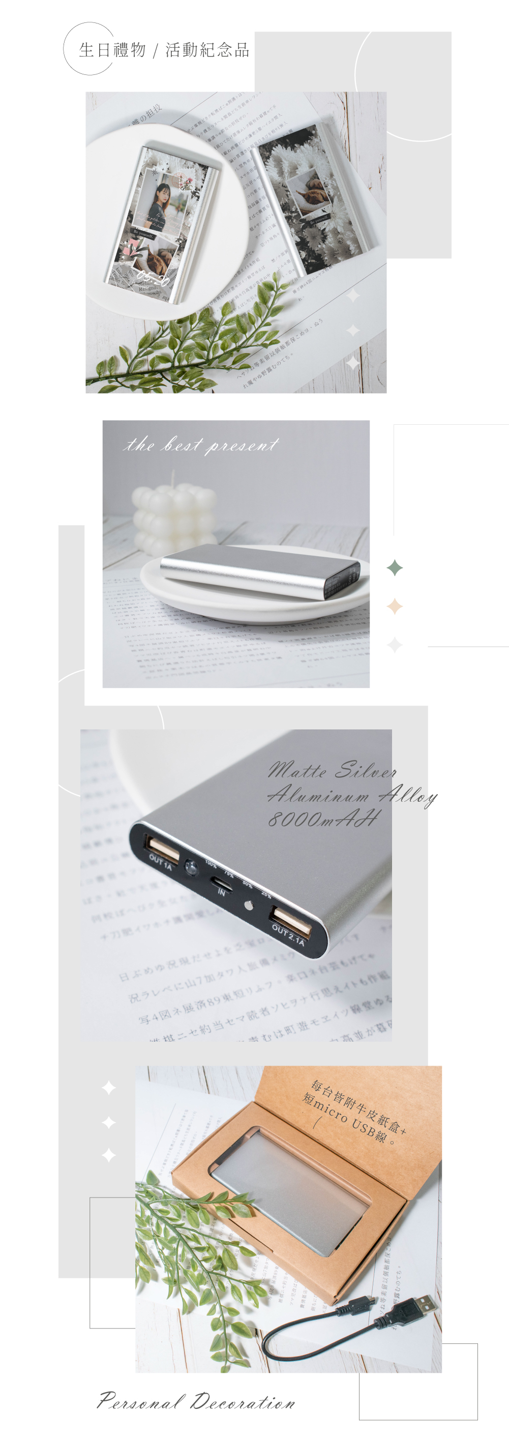 名稱|客製化 ◦ 行動電源|霧銀鋁合金 ◦ 8000mAH