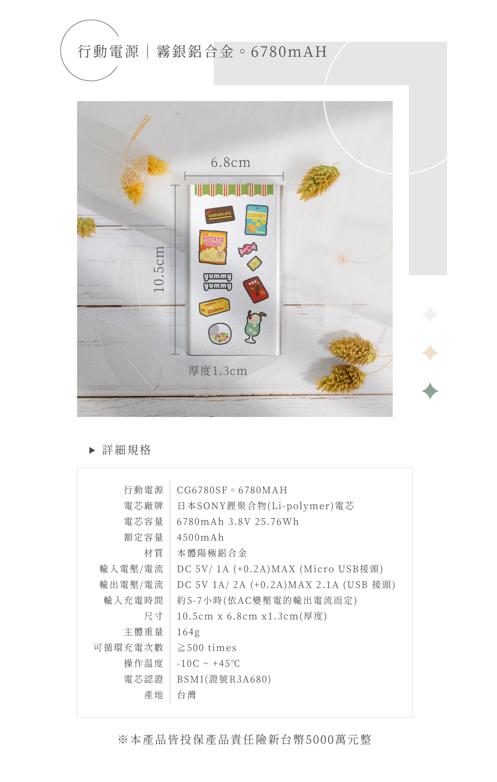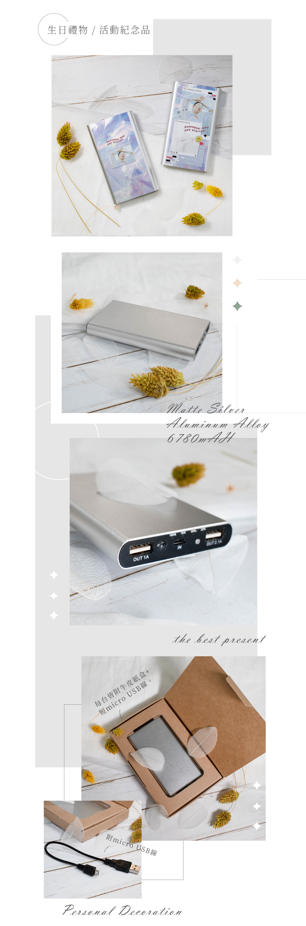 名稱|客製化 ◦ 行動電源|霧銀鋁合金 ◦ 6780mAH