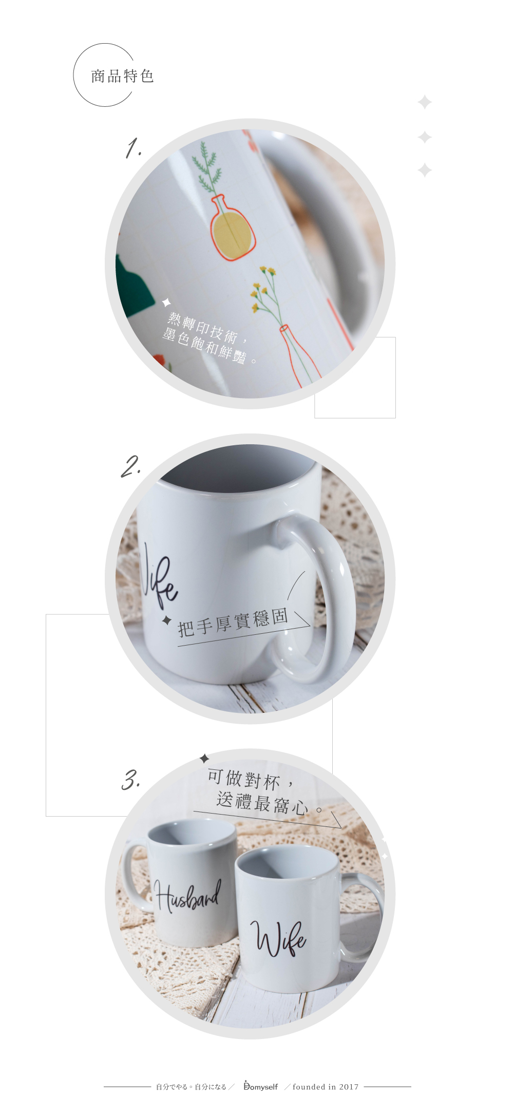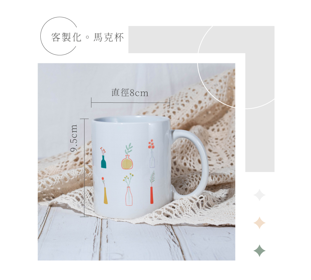 • 馬克杯無法滿版印製;把手左右約會有各2公分留白,上下約1公分留白。